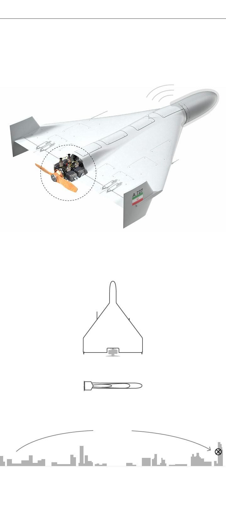La mayoría de los Shahed 136 son relativamente lentos, aunque en Ucrania se han visto variantes con motores a reacción más rápidos, y solo pueden transportar una carga explosiva de unos 50 kilos, suficiente para dañar un rascacielos, pero no para derribarlo. Sin embargo, su ruido, su gran tamaño y su picado terminal provocan terror.