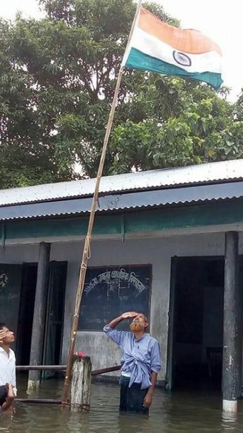 Haider Ali Khan apareció junto a su maestro y su primo, otro estudiante, saludando a la bandera tricolor en una fotografía que fue tomada el 15 de agosto del año pasado, en el 70º aniversario de la independencia de la India. Assam, un estado en el noreste indio, estaba gravemente inundado en aquel momento y el agua le llegaba al pecho a Khan y al estudiante a su lado.