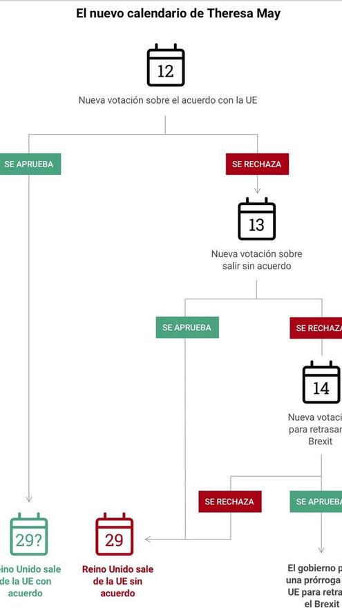 Tras este resultado, la Cámara de los Comunes votará este miércoles si prefiere un Brexit sin acuerdo y de consecuencias imprevisibles. Si tampoco hay Brexit sin acuerdo, el jueves se celebrará una nueva votación para retrasar la fecha de salida prevista: 29 de marzo.