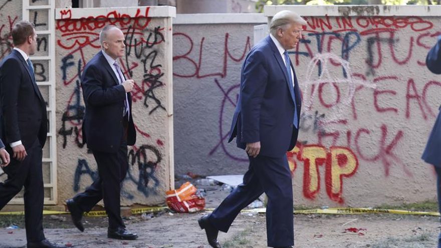 Minutos antes del toque de queda, que se inició a las 19.00 hora local, la policía dispersaba con pelotas de goma y gases lacrimógenos a los manifestantes congregados junto a la Casa Blanca para que el presidente, Donald Trump, pudiera salir a pie poco después. Trump cruzó caminando la plaza de Lafayette para dirigirse a la iglesia episcopal de Saint John, en la que han rezado todos los presidentes de EE.UU. desde el siglo XIX.