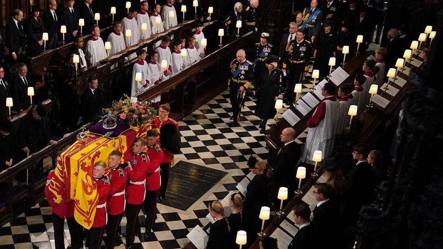 El féretro con los restos de la reina Isabel II ha sido bajados este lunes a la bóveda real de la capilla de San Jorge, en el castillo de Windsor, tras la ceremonia religiosa a la que asistieron miembros de la familia real y de otras casas reales.