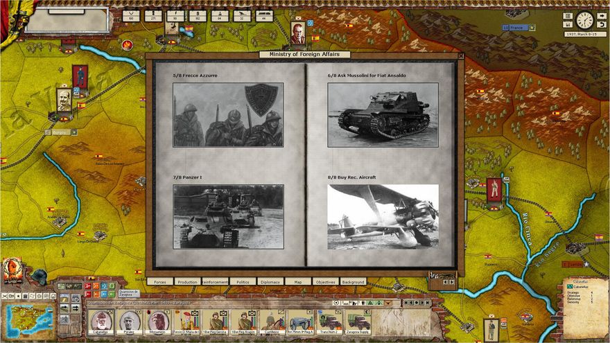 Ya solamente la interfaz y su acabado visual pueden echarte para atrás. El primer menú con el que nos topamos resulta arcaico y poco intuitivo, casi como si estuviera creado a base de recortes, y esa norma se extiende a buena parte del resto del juego. El tamaño de la fuente en los textos requiere del uso de una lupa, al igual que ocurre con ciertos iconos, y como decimos, en el tema gráfico no hay absolutamente nada que destacar. De hecho se puede decir que, comparado con títulos incluso mucho más antiguos como Hearts of Iron II, no tiene absolutamente nada que hacer, y eso que hablamos de un título que tampoco hace el menor de los alardes.