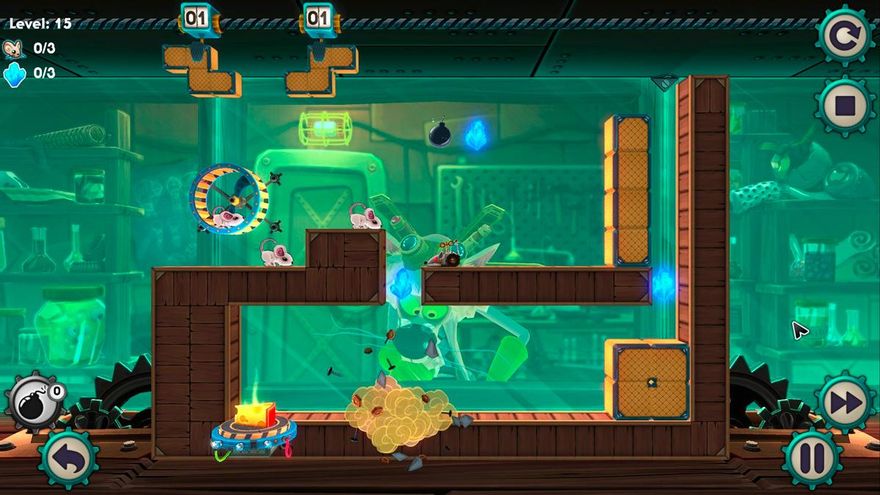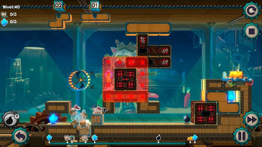 Con todo esto, ¿dónde está la gracia? Pues en que a lo largo del juego nos tocará darle un tanto al coco para experimentar nuevas estrategias según los recursos de los que dispongamos. La variedad de piezas y los peligros del escenario, como las caídas, el nombrado ácido o los ratones mecanizados asesinos, conseguirán hacernos sudar la gota gorda, sobre todo si tratamos de recolectar los tres cristales de energía repartidos por cada escenario sin perder ningún ratón en el intento.