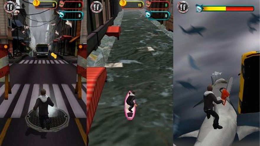 Todo aquel que haya jugado a títulos como Temple Run sabrá de qué va la cosa. Básicamente nuestro personaje corre sin parar y con un gesto sobre la pantalla haremos que cambie de carril para evitar que choque con los diferentes obstáculos de la pista, en este caso señales de tráfico, autobuses y, cómo no, tiburones puestos de cualquier manera en mitad de la carretera pegando bocanadas al aire. Así nivel tras nivel hasta el final de los tiempos por lo que vienen a ser 2,69 euros que deberíamos haber invertido en cualquier otra cosa más útil, como un pisapapeles, un bonito imán para nuestra nevera o una navaja de Albacete con la que abrirnos el tórax mientras jugamos a ‘esto’.