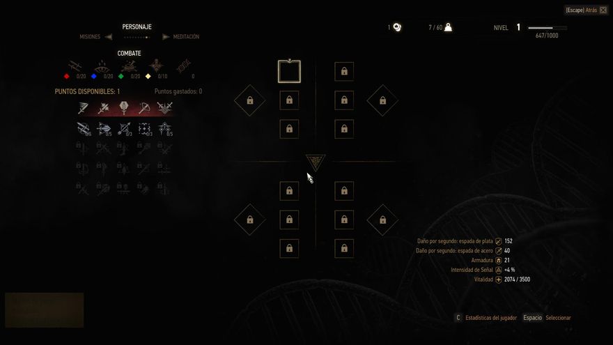 El árbol se divide en distintas ramas: combate, señales, alquimia, general y mutágenos. Las cuatro primeras funcionan de una forma similar, siendo la última especial. Dentro de las cuatro ramas generales podemos desbloquear o reforzar distintas habilidades. Por ejemplo, dentro de combate podemos gastar un punto de habilidad para que nuestros golpes rápidos con las espadas sean más poderosos. Cuando tengamos otro punto de habilidad, podemos gastarlo en reforzar aún más esos golpes rápidos, o bien desbloquear un movimiento que nos permite desviar las flechas cuando nos estamos cubriendo con la espada.