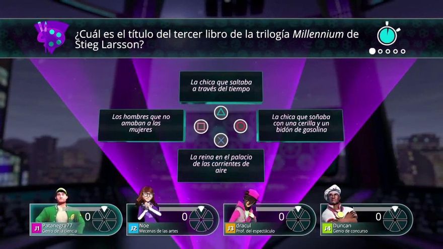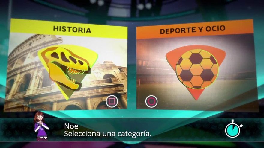 La puesta en escena nos recuerda inevitablemente a juegos como Buzz, es decir, una suerte de programa televisivo en el que los participantes se enfrentan en distintas pruebas para puntuar más que sus rivales a base de seleccionar las respuestas correctas y obtener así los preciados “quesitos”.