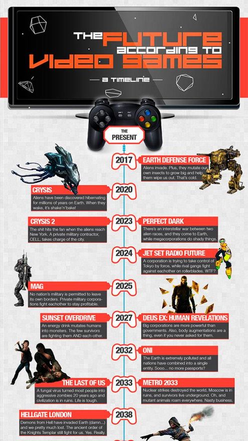 En dicho sentido, para que podamos ver cómo será el futuro según los videojuegos, Norbert Demeter ha diseñado una extensa línea temporal basándose en fuentes como Kotaku, IGN, Gamespot, Joystick y Wikipedia, y dando cabida a títulos tan aparentemente dispares como Destiny, ONI, Jet Set Radio, Remember Me, Doom III y Beyond Good and Evil.