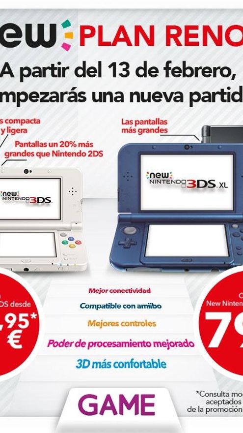 La cadena de tiendas GAME ha decidido aprovechar el lanzamiento para ofrecer a los jugadores la posibilidad de cambiar sus viejas Nintendo 3DS y Nintendo 3DS XL por las nuevas versiones. Para ello ha aplicado un Plan Renove por el que podremos hacernos con la nueva consola por 49,95€ o 79,95€, si elegimos la edición grande.