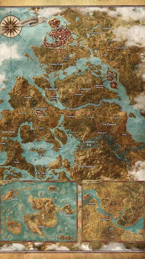Recientemente Amazon Francia publicó la ficha de producto de la guía oficial del juego, filtrando el mapa completo del RPG. Gracias a ello hemos podido ver el gigantesco mundo que podremos visitar de la mano de Geralt, incluidas las mencionadas islas a las que podremos acceder en barco. Podéis ver una imagen del mapa a continuación: