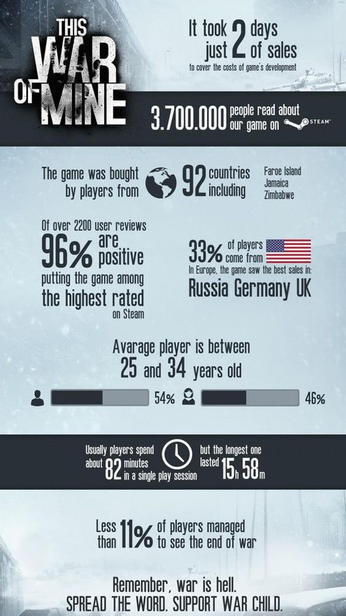 En la imagen distribuida por 11 bit Studios también se menciona que el juego ha sido comprado en 92 países distintos, siendo un 33% de las ventas en territorio americano. También comenta que la media de jugadores ronda entre los 25 y 34 años, y que el sexo de los jugadores es muy parejo: 54% hombres, 46% mujeres.