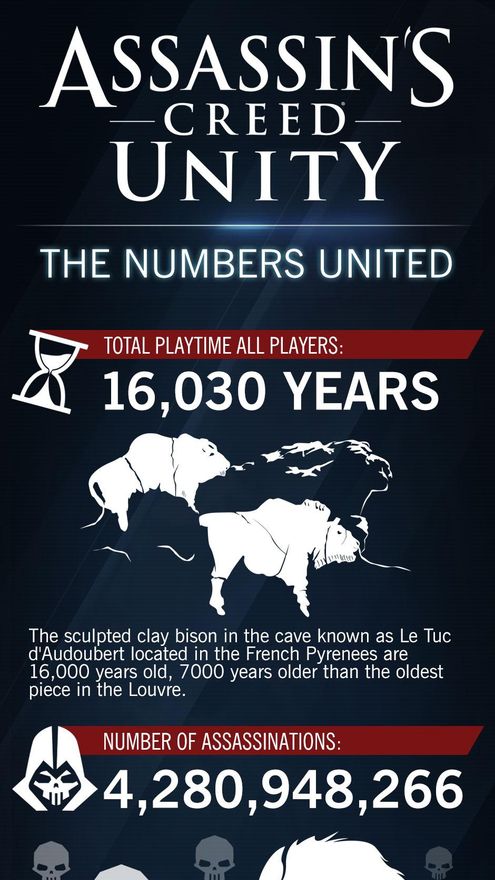 Al menos eso parecía. Ubisoft acaba de compartir varias estadísticas curiosas del juego, y los resultados son francamente positivos. Por ejemplo, a nivel mundial se ha jugado un total de 16.030 años, 7.000 años más que la pieza más antigua del museo Louvre. En este tiempo se han producido 4.280.948.266 asesinatos, es decir, 85 veces el número de víctimas de la Peste Negra que asoló Europa en el S.XIV.
