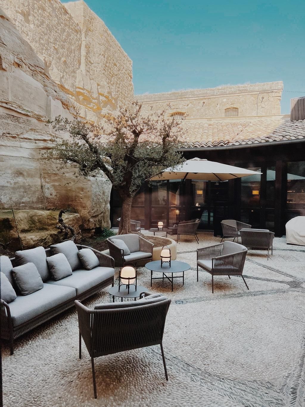 Las zonas comunes se completan con un amplio salón con chimenea y biblioteca con el antiguo aljibe de origen medieval y una cafetería adyacente, un pequeño gimnasio con terraza en la tercera planta o el párking privado con cargador Tesla para todo tipo de vehículos eléctricos. A nivel de servicios, hay que destacar la recepción 24 horas y el Concierge Service, para transfer o para cualquier necesidad que planteen los huéspedes.