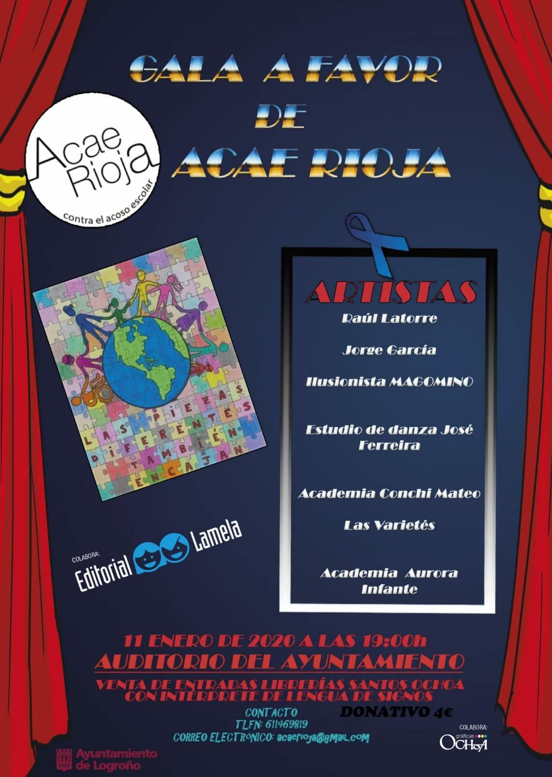 La Asociación contra el acoso escolar ACAE Rioja va a celebrar su I Gala en el Auditorio del Ayuntamiento de Logroño el día 11 de enero 2020 a las 19 horas.