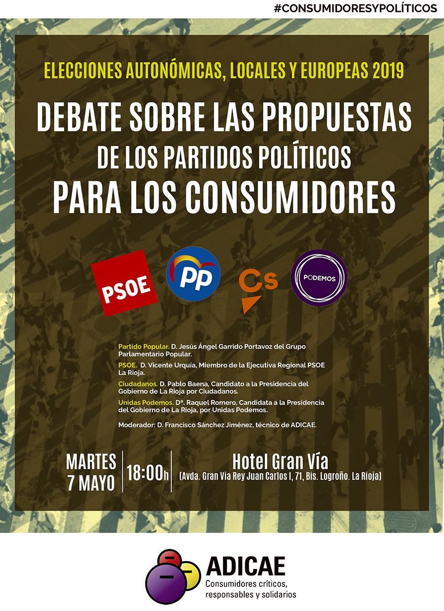 La Asociación de Consumidores y Usuarios de Bancos, Cajas y Seguros (Adicae) La Rioja ha organizado para este martes, 7 de mayo, a partir de las 18 horas, en el Hotel Gran Vía de Logroño, el primer debate sobre las propuestas de los partidos políticos para los consumidores ante las Elecciones Autonómicas, Locales y Europeas.
