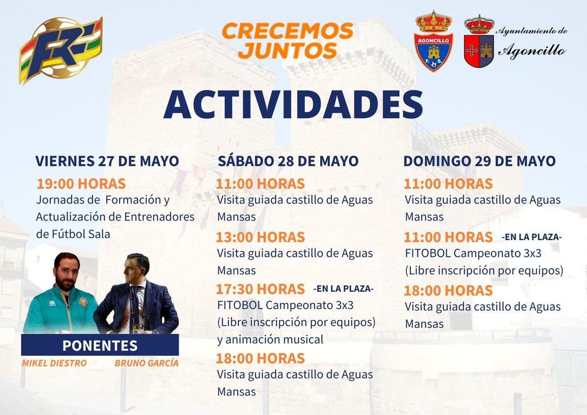 La Federación Riojana de Fútbol se ha hecho eco en sus redes sociales de la celebración de la fase final de la Copa Fútbol Sala Federación Riojana de Fútbol que se disputa en el Polideportivo Municipal de Agoncillo este fin de semana, los días 28 y 29 de mayo. El horario de los cuartos de final del sábado es el siguiente: Cerverano-Lardero (11:00), Camino Cienta-Nalda (13:00), Soto Sala-Albelda 'A' (16:30) y Sorzano-Cenicero (18:30).