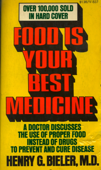 En 1973 se publicó en Estados Unidos este libro –“La comida es su/tu mejor medicina”- que puso en jaque a los laboratorios de específicos, ya que explicaba, de forma sencilla, aunque recurriendo únicamente a conceptos bioquímicos elementales, como la alimentación altera el funcionamiento del organismo –Biblioteca del autor-.