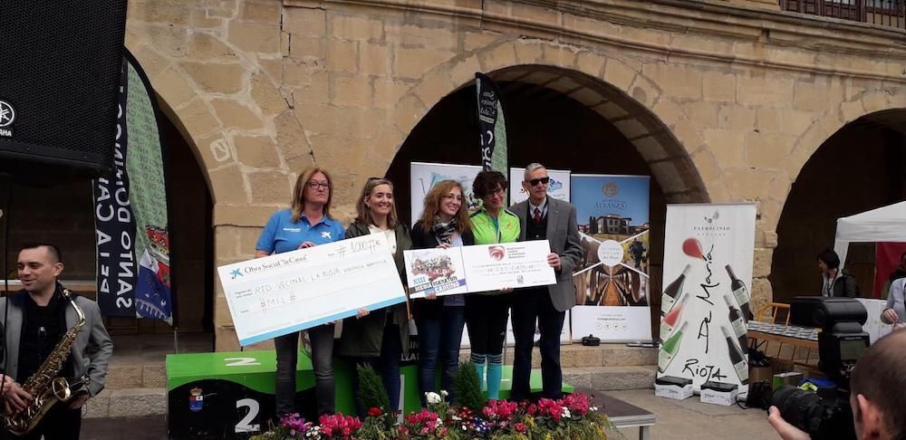 Sin duda, el momento más emotivo ha tenido lugar cuando Cristina Maiso ha recogido, en nombre de la Red Vecinal contra la Violencia de Género, sendos cheques entregados por el Club Maratón Rioja y la Obra Social “la Caixa”. Así, el equipo femenino del Club Maratón Rioja, que será reconocido como Mejor Deportista Veterana en la próxima Gala del Deporte Riojano, ha entregado el cheque de lo recaudado con las inscripciones femeninas de la XIII Media Maratón del Camino –un euro por cada inscripción femenina-, que ha ascendido a 250. Mientras que Rosalía Malo, directora del Área de Negocio Caixabank en La Rioja, hizo entrega de un cheque por valor de 1.000 euros.