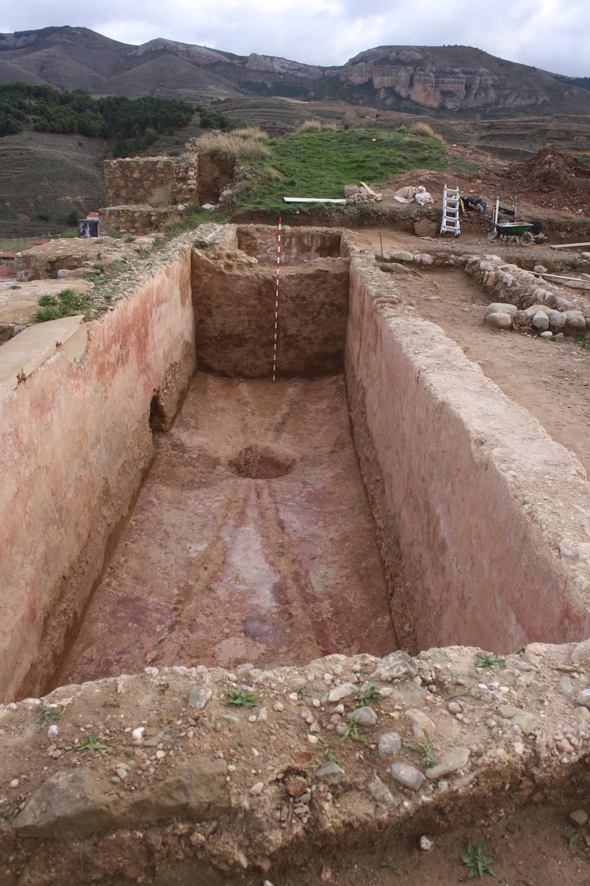 - Otro de planta rectangular, excavado en la presente campaña, que se conserva prácticamente íntegro, a excepción de su cubierta, con capacidad para 120.000 litros agua. El fondo dispone de un ingenioso remate de medias cañas que conducen a una poceta o torco central, para facilitar su limpieza y mantenimiento. Además este aljibe fue remodelado en un momento determinado, reduciendo su tamaño útil.