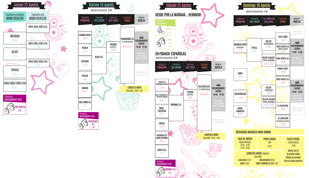 El formato repite el éxito de las anteriores ediciones: el jueves 23 de agosto MUWI La Rioja Music Fest tomará como marco las Murallas del Revellín en una jornada abierta al público, mientras que el viernes 24, sábado 25 y domingo 26 el escenario principal será Bodegas Franco-Españolas, la bodega urbana por excelencia de la capital riojana; situada a escasos metros del centro de la ciudad.