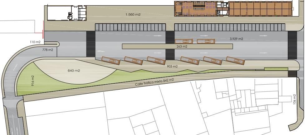 La terminal de autobuses se plantea a continuación de la calle Pedro de Lepe, con capacidad suficiente para 6 dársenas para autobuses con aparcamiento frontal en diagonal que facilitará la subida y bajada de viajeros en condiciones de seguridad.