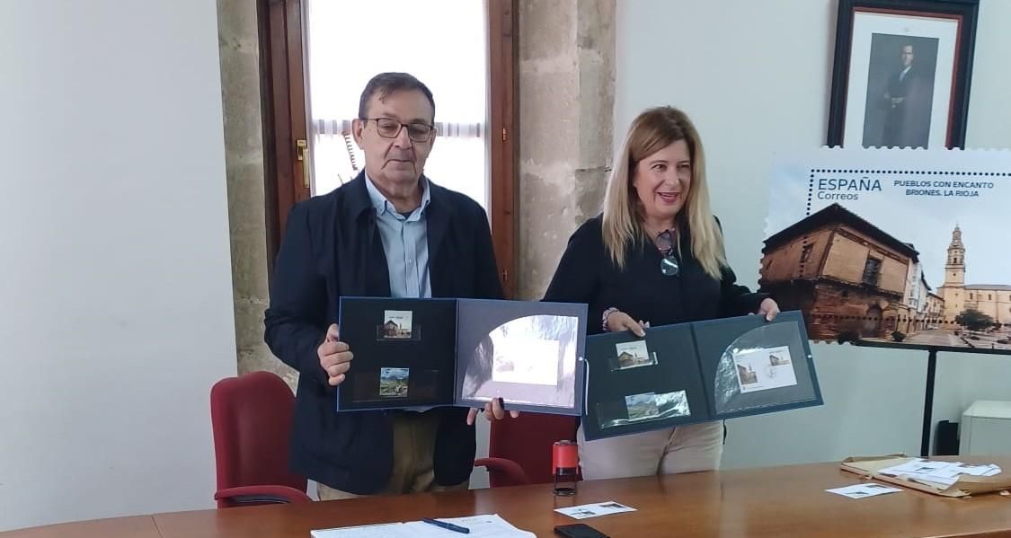 El alcalde de Briones, Gerardo Antonio Cueto, y la directora de Filatelia de Correos, Leire Díez, han presentado en la mañana del lunes en el salón de actos del Ayuntamiento el sello dedicado al municipio riojano que forma parte de serie anual Pueblos con encanto.