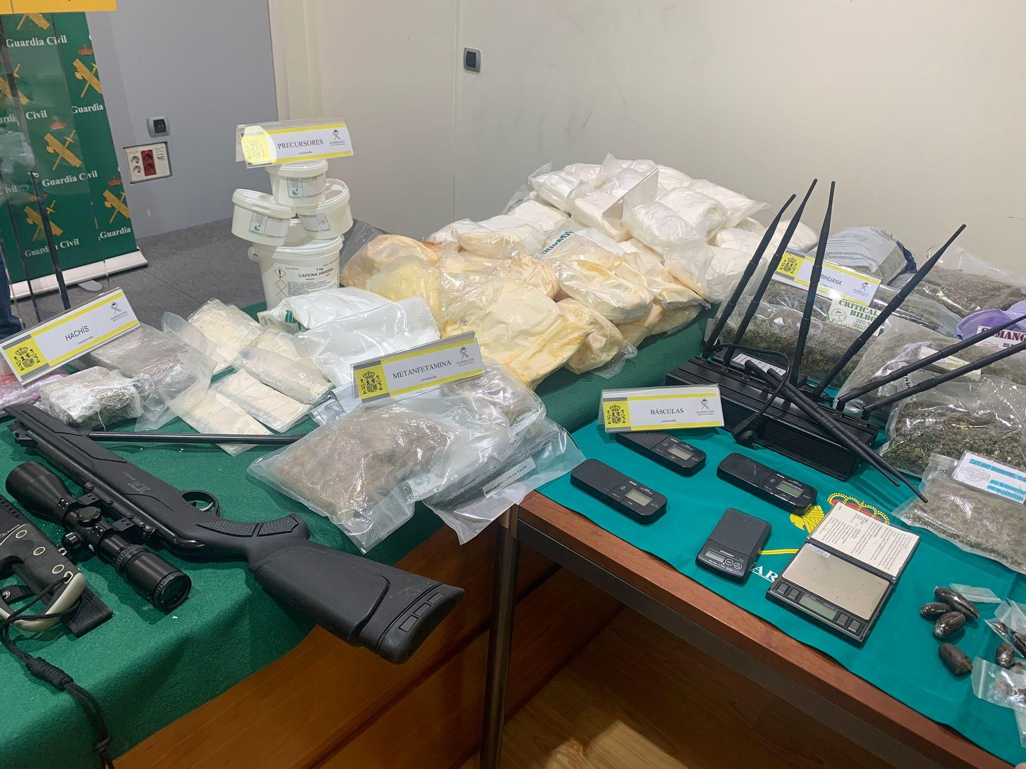 El resultado final de la operación se ha saldado con la incautación de 95 kilos de sulfato de metanfetamina de gran pureza (speed), un kilo y medio de cristal, 1.265 plantas de marihuana, seis kilos de cogollos de marihuana, dos kilos y medio de hachís, entre otras drogas. También han sido intervenidos cinco vehículos y una motocicleta, cinco armas de fuego y munición, machetes, material informático, chalecos y placas policiales falsas y abundante documentación para su análisis y estudio.