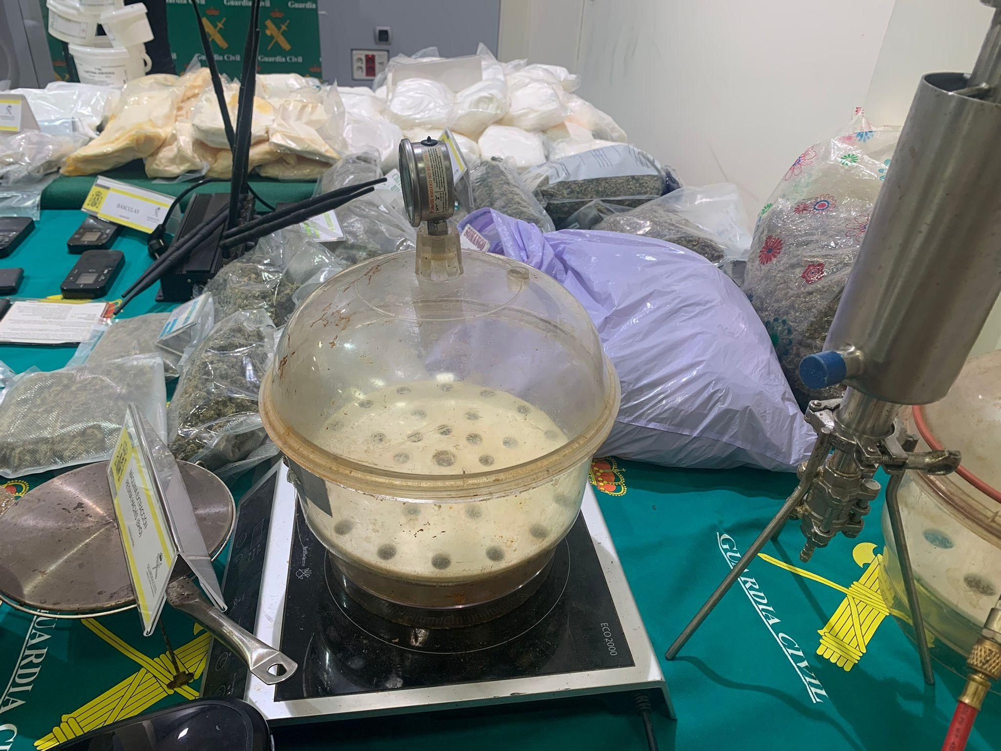 En su interior -de 600 metros cuadrados- los investigadores hallaron un completo laboratorio para la elaboración de BHO -Butan Hasch Oil-, también conocido como aceite de hachís, seis kilos de cogollos de marihuana y un sofisticado laboratorio tipo “indoor” dotado con 1.265 plantas y con tecnología para la producción sistemática de esta sustancia.