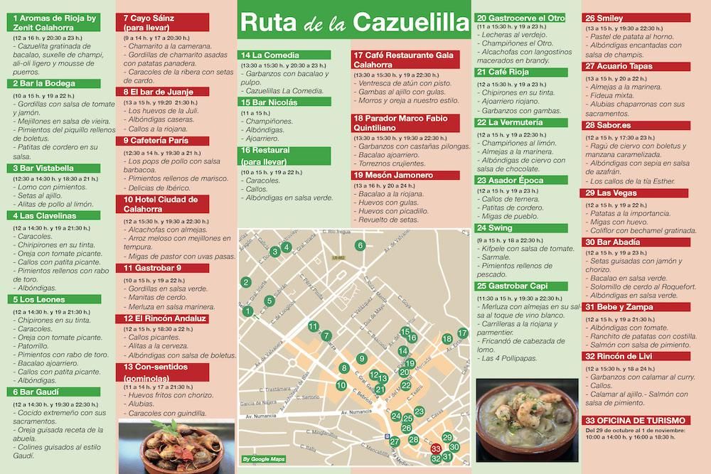 En esta ocasión, en las jornadas de la cazuelilla participarán 32 establecimientos (3 más que en el año anterior) en los que se servirán hasta tres raciones diferentes con el tradicional formato de emplatado de cazuela de barro. Las diferentes cazuelillas serán servidas entre el 27 de octubre y el 1 de noviembre, por regla general entre las 12:00 y las 15:00 y de 18:00 a 22:00 aunque en el folleto informativo se indica específicamente el horario de cada establecimiento.