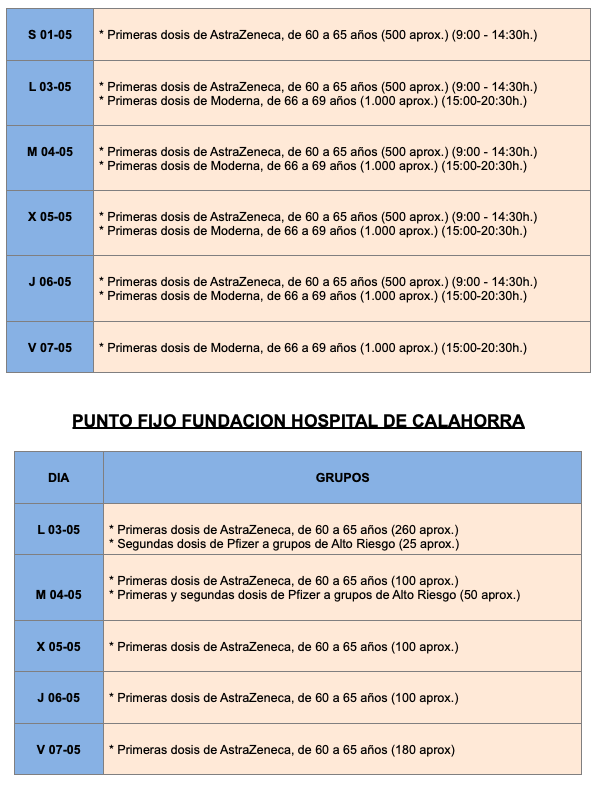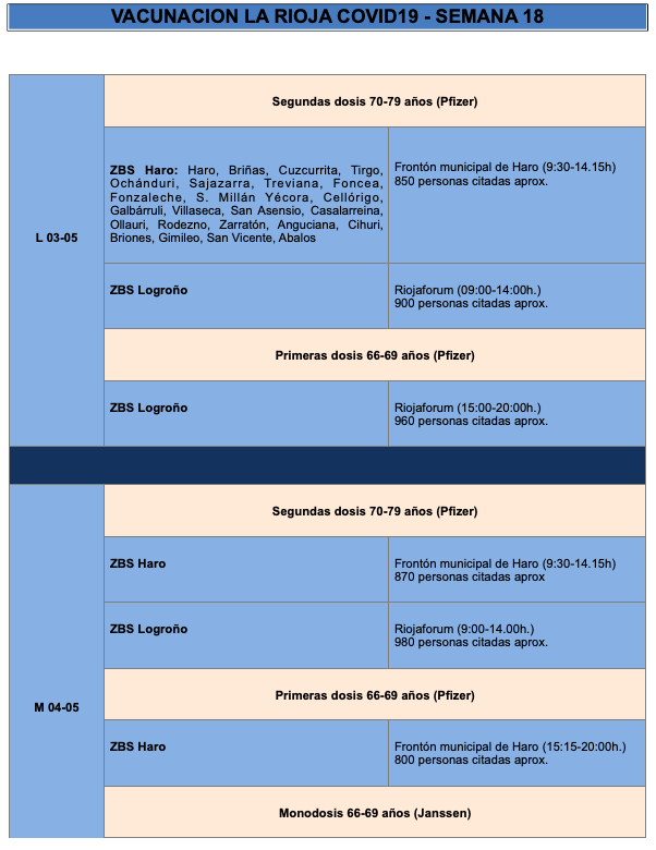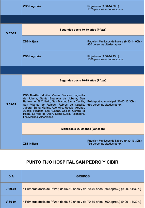 El Logroño, también se seguirá citando a las personas de este grupo de edad, que recibirán el suero de Pfizer en Riojaforum y el de Moderna en el Hospital San Pedro. También en el Hospital San Pedro y en la Fundación Hospital de Calahorra continúa la vacunación con AstraZeneca a las personas entre 60 y 65 años.También arranca la vacunación de la segunda dosis a los de 70 a 79 años en Logroño y en los pueblos correspondientes que cumplen los 21 días desde la primera.