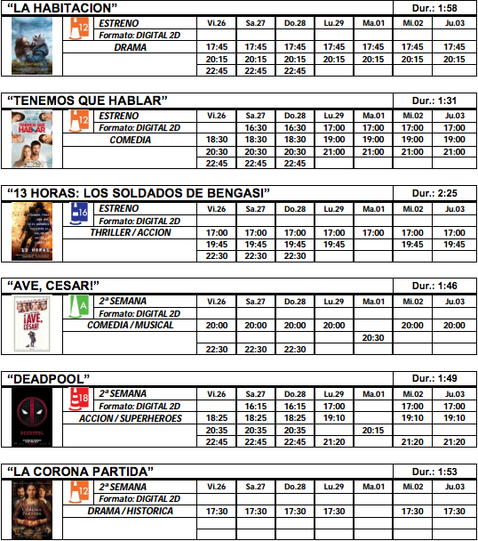 Llegan a nuestros cines las dos últimas películas nominadas a los premios Oscar: los dramas irlandeses `La habitación´y `Brooklyn´. Para los amantes del cine de acción, la última cinta de Michael Bay `13 horas: los soldados de Bengasi´.