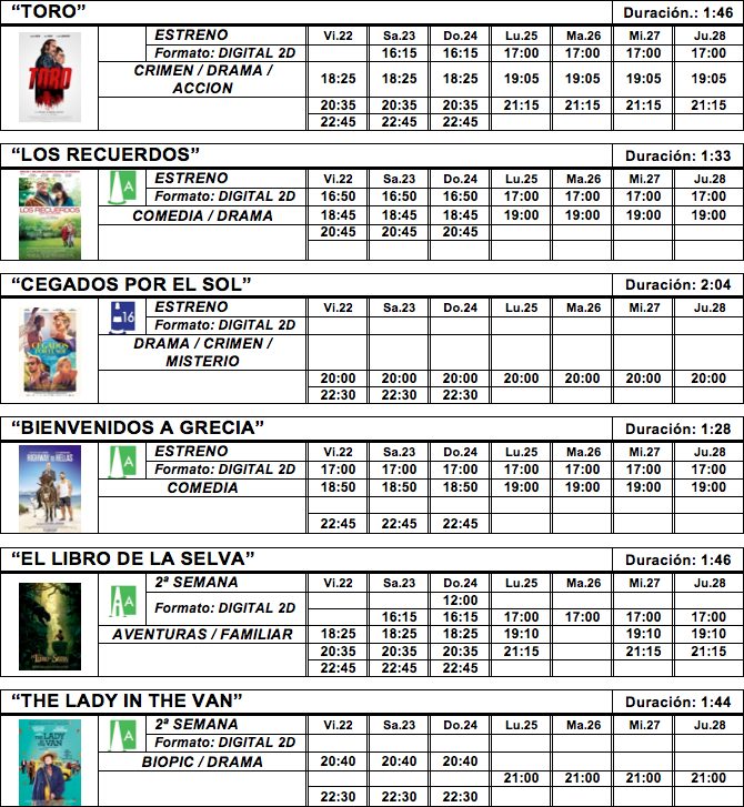 Llega a nuestras pantallas `Toro´, un trhiller español con mucho sabor a cine americano de los años 70 protagonizado por dos portentosos Mario Casas y Luis Tosar, quienes tendrán que huir de las garras de un peligroso José Sacristán. `Los recuerdos´, una entrañable comedia francesa en la que un padre y un hijo tendrán que unirse en la búsqueda de la abuela, y en `cegados por el sol´, una estrella del rock que pasa unos días en el Mediterráneo junto con su novio, acaba invitando a su antiguo manager y a su hija a acompañarles. Lo que iban a ser unos días de descanso, se convierten en unas extrañas vacaciones.