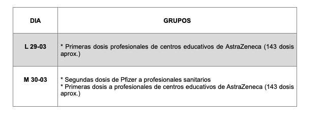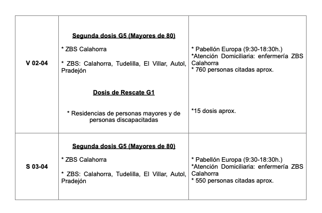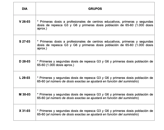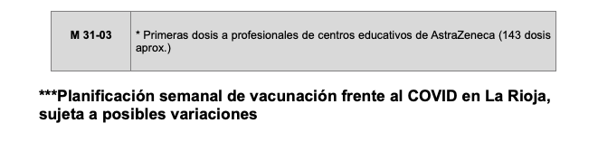 De forma paralela, se vacunará durante toda la semana (fines de semana incluidos) en el Hospital San Pedro y el CIBIR a profesionales de centros educativos, las dosis de repesca a los grupos 3 y 6 (otros profesionales sanitarios y esenciales) y a la franja de edad de 60 a 65 con AstraZeneca. En la Fundación Hospital de Calahorra, se suministrarán primeras dosis a profesionales de centros educativos con AstraZeneca y la segunda con Pfizer a sanitarios.
