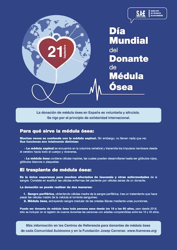 “Desde que en 1957 se realizara el primer trasplante de médula ósea, este tipo de intervenciones ha evolucionado de tal manera que en la actualidad se emplean para curar una importante variedad de enfermedades que afectan a la sangre, como la leucemia, el linfoma o la aplasia medular, entre otras. Pero para seguir avanzando y salvando vidas, es fundamental contar con donantes compatibles, por ello, desde SAE nos hemos querido sumar al Día Mundial del Donante de Médula Ósea con un cartel informativo para concienciar a la población de la importancia de hacerse donante. Asimismo, dentro de nuestra labor formativa para los profesionales técnicos sanitarios, durante este año abordaremos la donación de médula ósea en diferentes actividades, como nuestro XXXI Congreso Nacional de Técnicos en Cuidados de Enfermería (TCE) y Técnicos en Emergencias Sanitarias (TES), que celebraremos el próximo año en Sevilla y girará en torno a la donación y la vida de los pacientes trasplantados”, explica Daniel Torres, secretario de acción social y formación de SAE.