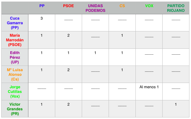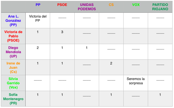 Sofía Montenegro, cabeza de lista del Partido Riojano, cree que cuatro partidos se llevarán un escaño cada uno: PP, PSOE, PR y Ciudadanos, mientras que Silvia Garrido, candidata al Senado por Vox, apuesta porque su partido “va a ser la sorpresa en estas elecciones”.