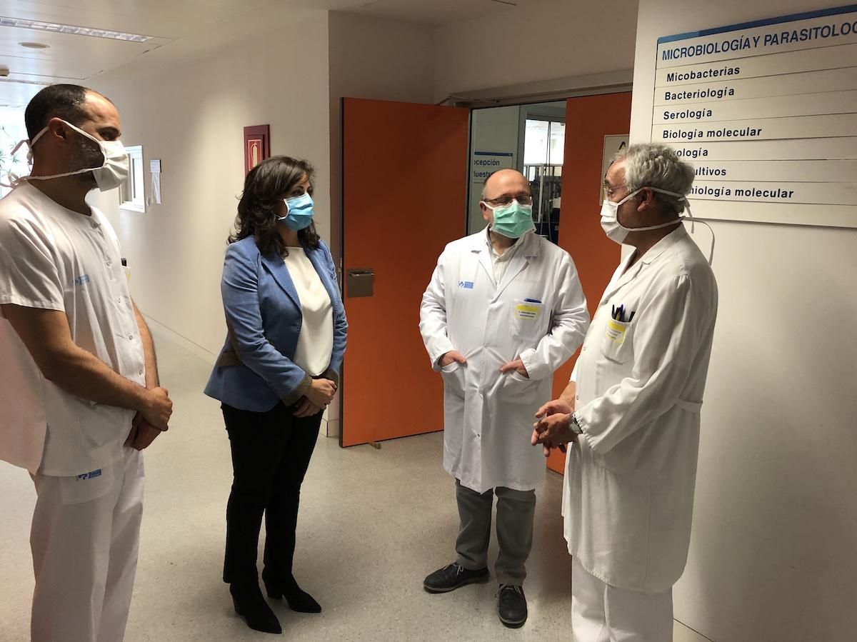 La presidenta del Gobierno de La Rioja, Concha Andreu, junto con la consejera de Salud, Sara Alba, y el director del Área de Salud de La Rioja, Alberto Lafuente, han visitado el laboratorio de microbiología del Hospital San Pedro de Logroño.