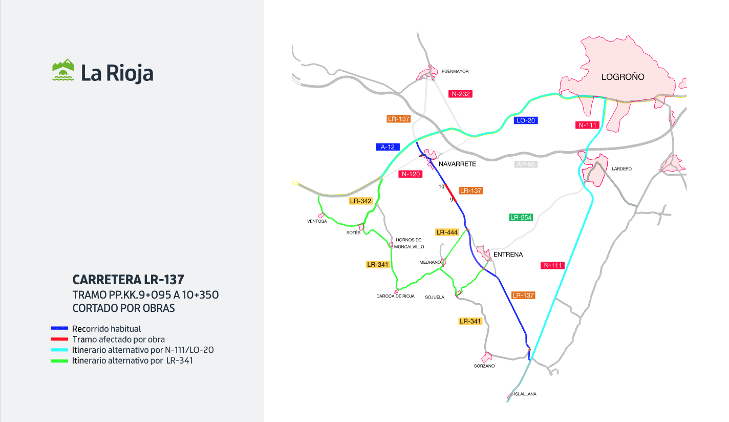 - Desvío de tráfico: Itinerario alternativo por N-111 / LO-20 / A-12 Itinerario alternativo por LR-254 / LO-20 / A-12 Itinerario alternativo por LR-444 / LR-341 / LR-342