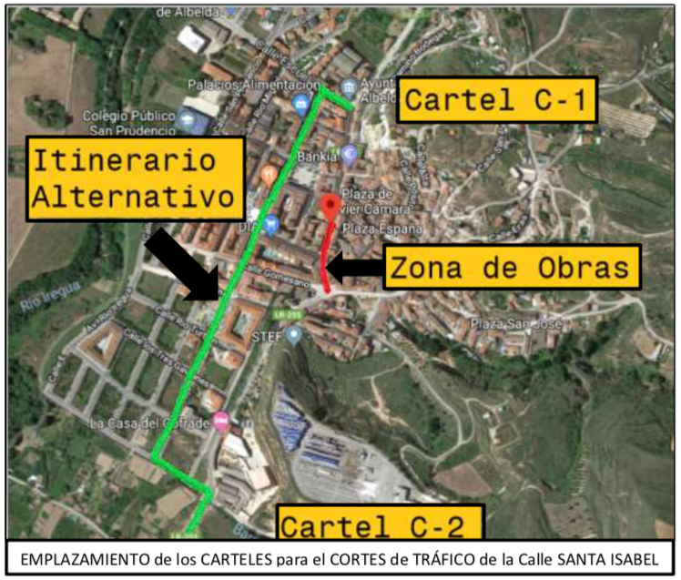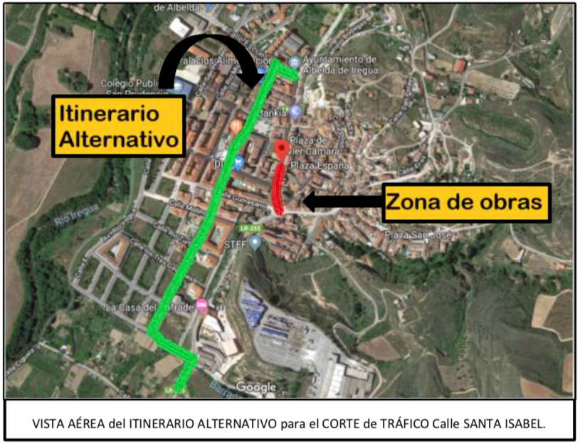 La Consejería de Fomento y Política Territorial del Gobierno de La Rioja informa de que, debido a las obras de ejecución de la nueva terminal de autobuses de Albelda de Iregua, se cortará el tráfico en el tramo comprendido entre la rotonda de la carretera LR-225 y el cruce de la calle Santa Isabel con la calle Pedro José Trevijano.