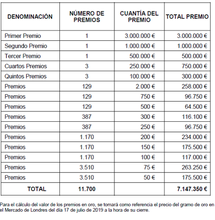 El Sorteo de Oro, que se celebrará el próximo 18 de julio en Palma de Mallorca, repartirá los siguientes premios: