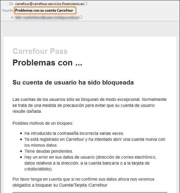 Por lo general, este tipo de correos fraudulentos contienen asuntos relacionados con 'problemas con su cuenta Carrefour' o 'problemas con su cuenta Carrefour Pass'. Estos correos avisan al usuario que su cuenta ha sido bloqueada y que para activarla debe seleccionar el enlace que se encuentra en la parte inferior del correo. El remitente simula ser Carrefour pero el enlace apunta a un dominio que no es legítimo.
