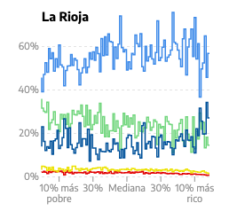Si tenemos en cuenta el origen de esos ingresos, vemos que en La Rioja la mayor fuente de ingresos es el salario (línea azul clara), tanto entre la población más rica como entre la población más pobre . Las pensiones (línea verde) suponen también una importante fuente de ingresos, con menor peso entre las rentas más altas. Al contrario que los ingresos procedentes de capital y actividades económicas (línea azul oscura). Las rentas más altas son las que obtienen más ingresos por esta vía (alquileres, etc). Por último, se aprecia en el gráfico que en La Rioja tienen un peso mínimo los ingresos que proceden de prestaciones sociales (línea amarilla) o prestaciones por desempleo (línea roja).