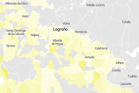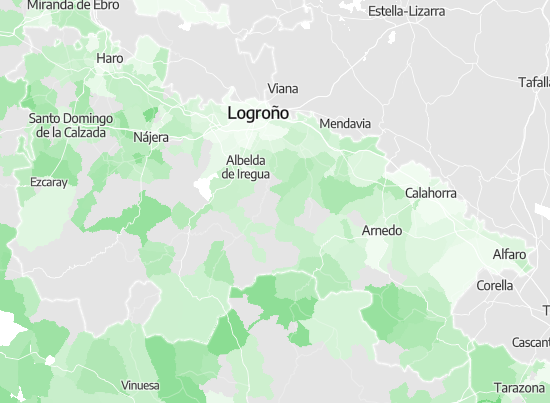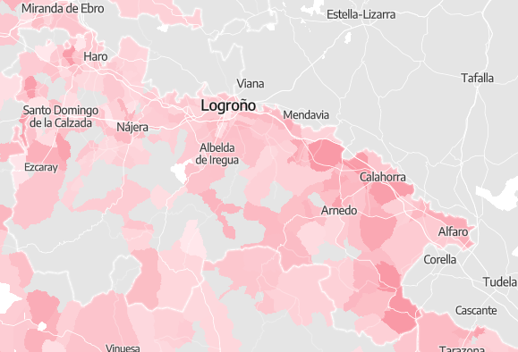 En este primer mapa que mide el volumen de las rentas por hogar, sin tener en cuenta su origen, vemos que en La Rioja, como en el resto de España, los hogares con más ingresos se sitúan en la capital y su área metropolitana.