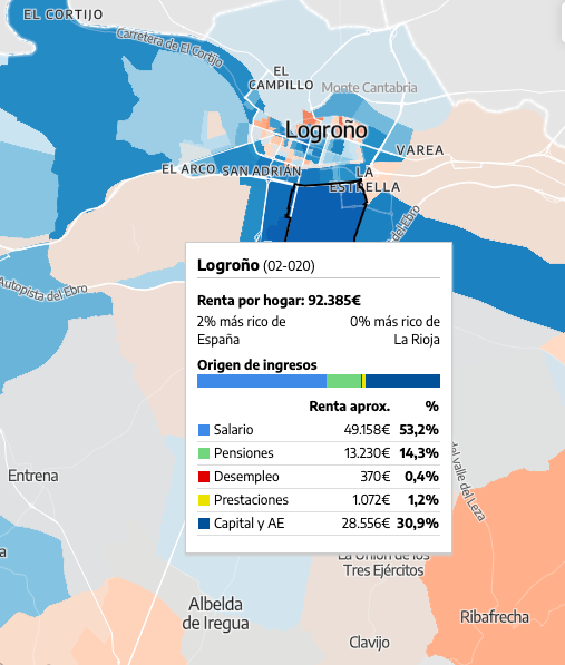 Hay zonas de Logroño, especialmente en la zona zur, en las que los ingresos por hogar superan los 90.000 euros anuales de media, llegando a situarse entre el 2% de la población más rica de España. Vemos en este caso que la mayor parte de los ingresos de estas familias proceden de salarios y de capital y actividades económicas. El paro y las prestaciones sociales son prácticamente inexistentes.