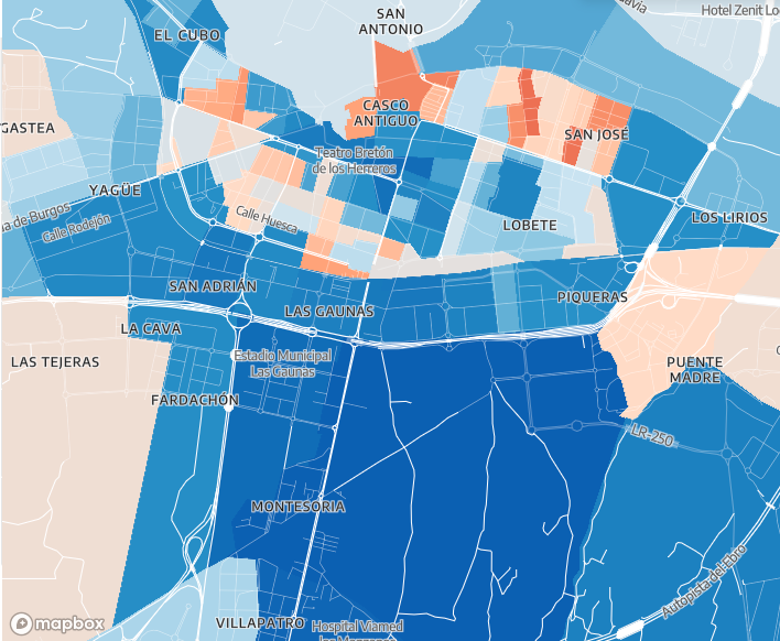Vemos cómo las rentas son más altas en el centro y la zona Sur de la ciudad mientras que el Casco Antiguo y el norte del río Ebro son zonas con ingresos mucho más bajos.
