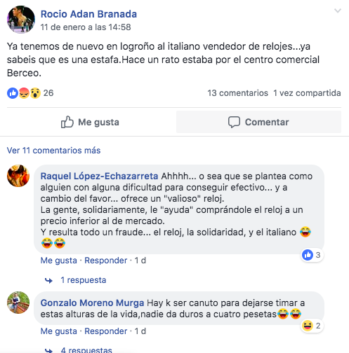 A principios del mes de marzo del año pasado, varios internautas alertaron de la presencia de un italiano utilizaba el mismo método para estafar a la gente. Rioja2 consiguió hablar con uno de ellos y, finalmente, a finales de marzo la Policía Nacional detuvo en Miranda de Ebro (Burgos) a un hombre que se hacía pasar por comercial de una exclusiva marca de relojes y que se dedicaba a la venta de falsificaciones.