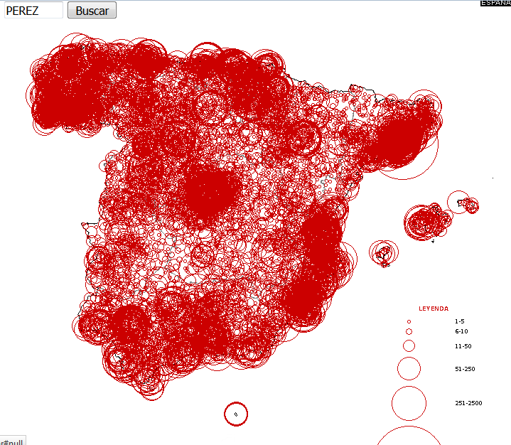 A través de un sistema de círculos rojos, la aplicación indica en el mapa los lugares en los que existen registradas personas con ese apellido, especificando el número de personas aproximado. Además, junto a la leyenda, aparece el número de localidades en las que se ha encontrado dicho apellido. La búsqueda puede realizarse también con dos apellidos.