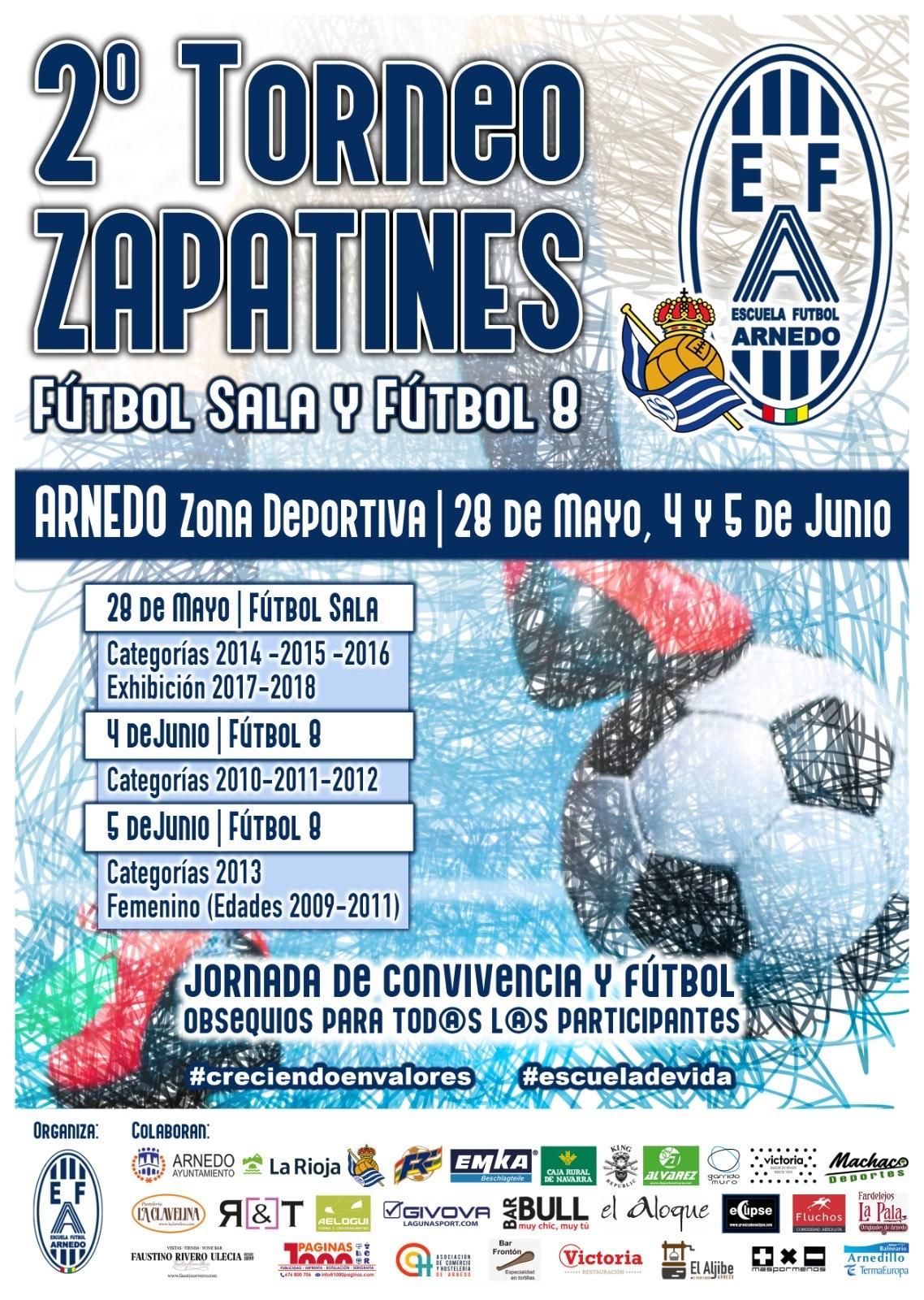 La Escuela de Fútbol de Arnedo ha informado mediante una nota de prensa de la presentación el pasado viernes de la segunda edición del torneo 'Zapatines' de fútbol base y fútbol sala que se celebrará en la localidad riojabajeña el 28 de mayo y los días 4 y 5 de junio. La nota informativa reza de la siguiente manera: