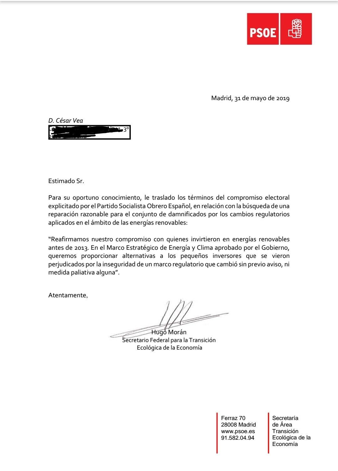 Ahora mismo, César Vea confiesa estar “decepcionado” con el presidente del Gobierno Pedro Sánchez. En su poder el actor tiene dos cartas. Una de ellas firmada por el Secretario de Estado, Hugo Morán. Carta, recuerda Vea, en la que el Secretario de Estado reafirma su compromiso “con quienes invirtieron en renovables antes de 2013”. La misiva también refleja que quieren “proporcionar alternativas a los pequeños inversores que se vieron perjudicados por la inseguridad de un marco regulatorio que cambió sin previo aviso ni medida paliativa alguna”.