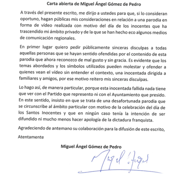 Pide disculpas a las personas que se hayan sentido ofendidas por esta parodia que “ahora reconozco de mal gusto y sin gracia”. Entiende el alcalde camerano que los temas abordados y los símbolos utilizados hayan podido ofende “a quienes vean el vídeo sin entender el contexto” e insiste en que era únicamente “una inocentada dirigida a familiares y amigos”.