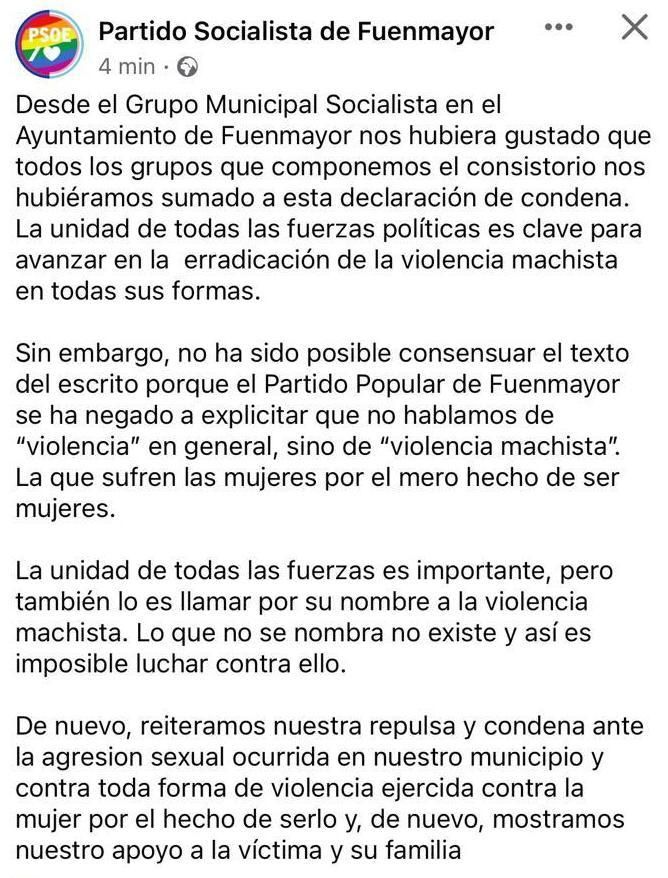 Concluye el comunicado de los socialistas mostrando su “repulsa y condena” ante la citada agresión sexual y mostrando su apoyo “a la víctima y su familia”.