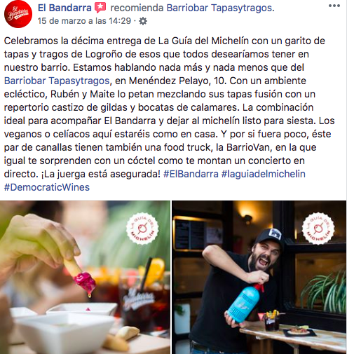 Los cocineros riojanos siguen recibiendo buenas noticias. En este caso el motivo de celebración está en un local ubicado en la calle Menéndez Pelayo de Logroño, el Barriobar TapasyTragos. “Celebramos la décima entrega de la La Guía del Michelín con un garito de tapas y tragos de Logroño de esos que todos desearíamos tener en nuestro barrio”.